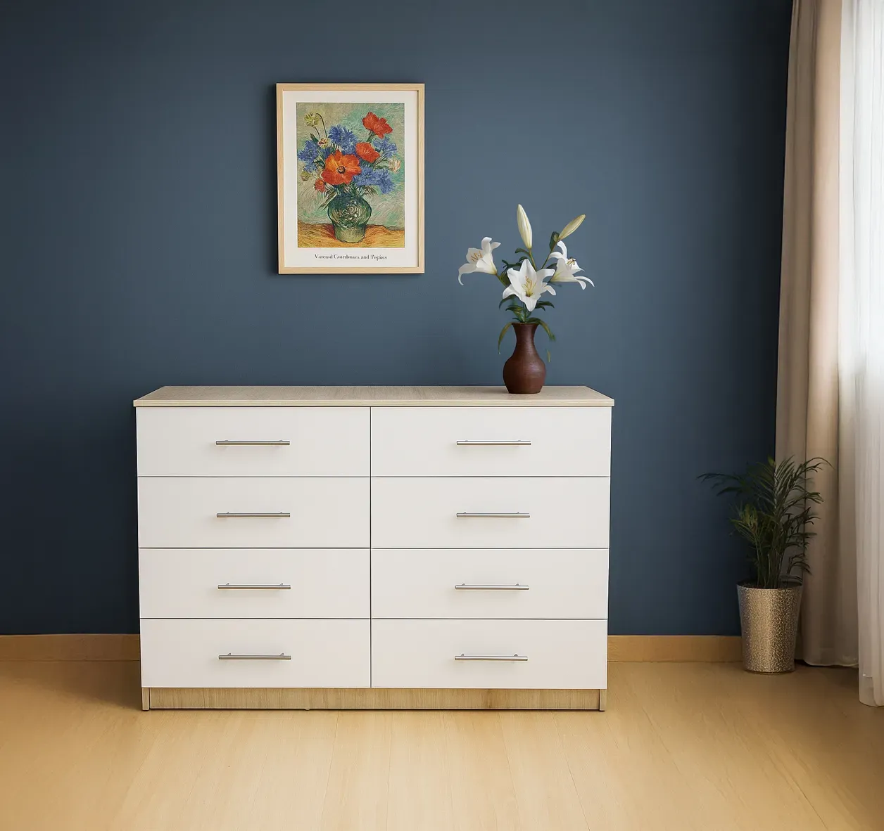 El gavetero Nórdico es una mezcla de modernidad y funcionalidad. Con Melamina Chilena de 15mm de alta calidad, este mueble cuenta con ocho cajones bien diseñados. Su estilo nórdico y la resistencia de la melamina lo convierten en una opción atractiva para cualquier ambiente.